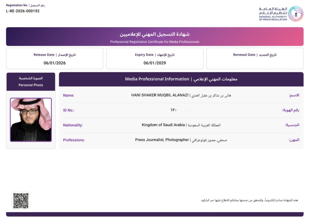 أهلاً بكم في منصتي الرسمية حيث يسعدني جداً تواصلكم ومتابعتكم. أنا صحفي وإعلامي مرخص من هيئة تنظيم الإعلام برقم 555797 وعضو هيئة الصحفيين السعوديين وعدة جمعيات إعلامية. أعمل في صحيفة أضواء الإلكترونية وتعليم الحدود الشمالية بمدينة عرعر. كما أنني حاصل على العديد من الدورات التدريبية في شتى المجالات ومن بينها الإعلام والتصوير الفوتوغرافي. وأتشرف بمتابعتكم لي ويسعدني تواصلكم من خلال الضغط على الصورة مباشرة لبدء المتابعة عبر منصاتي التالية :